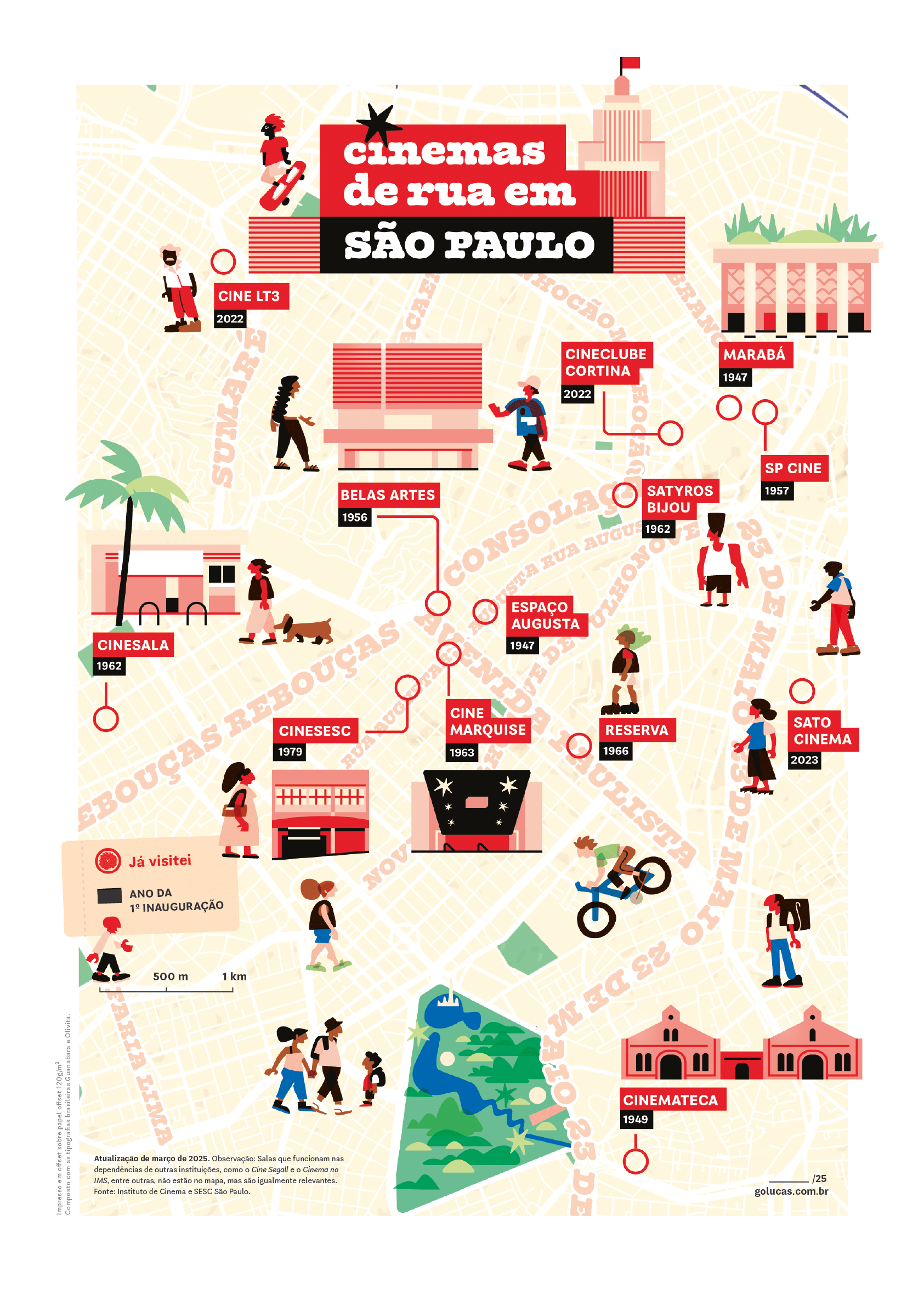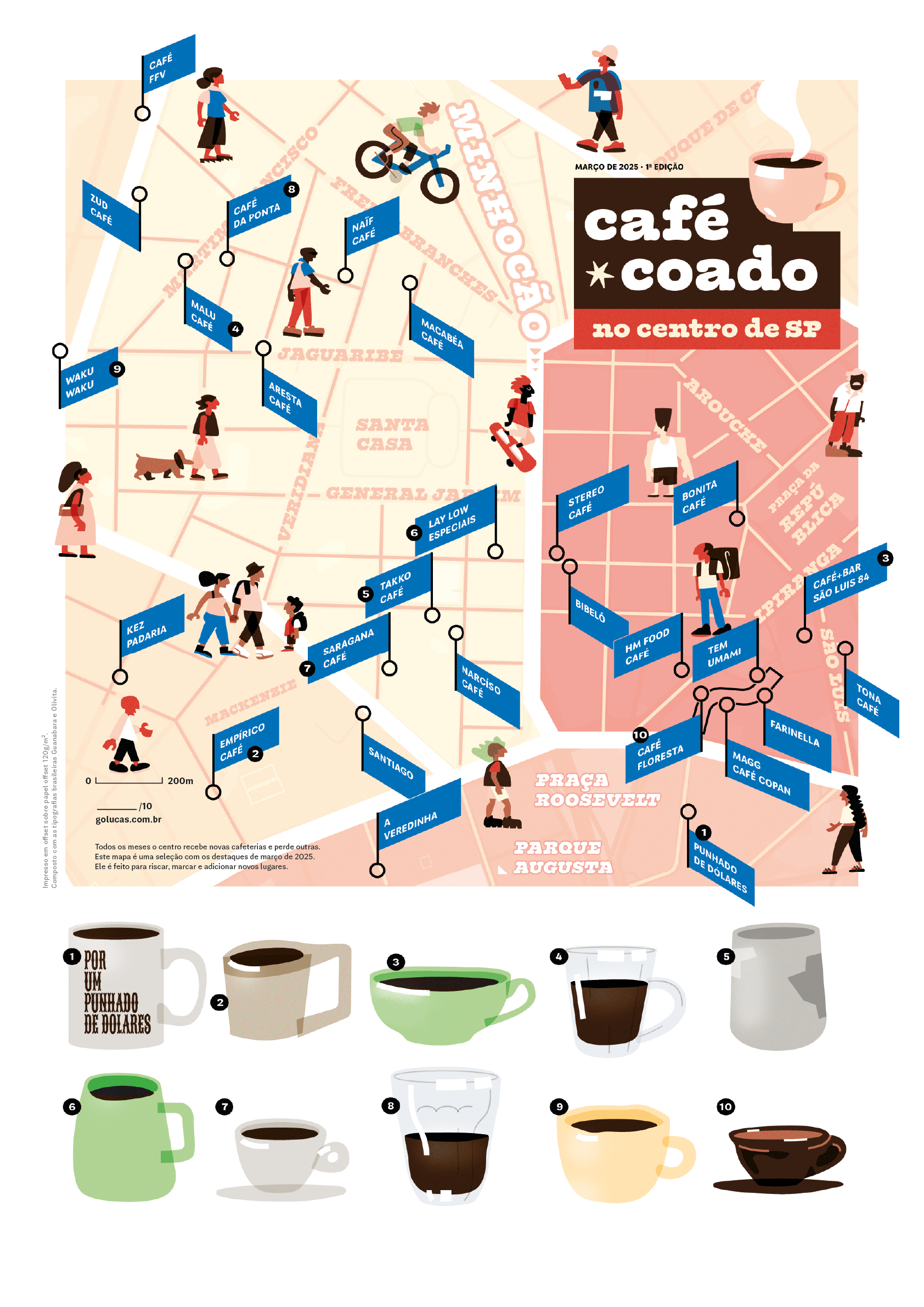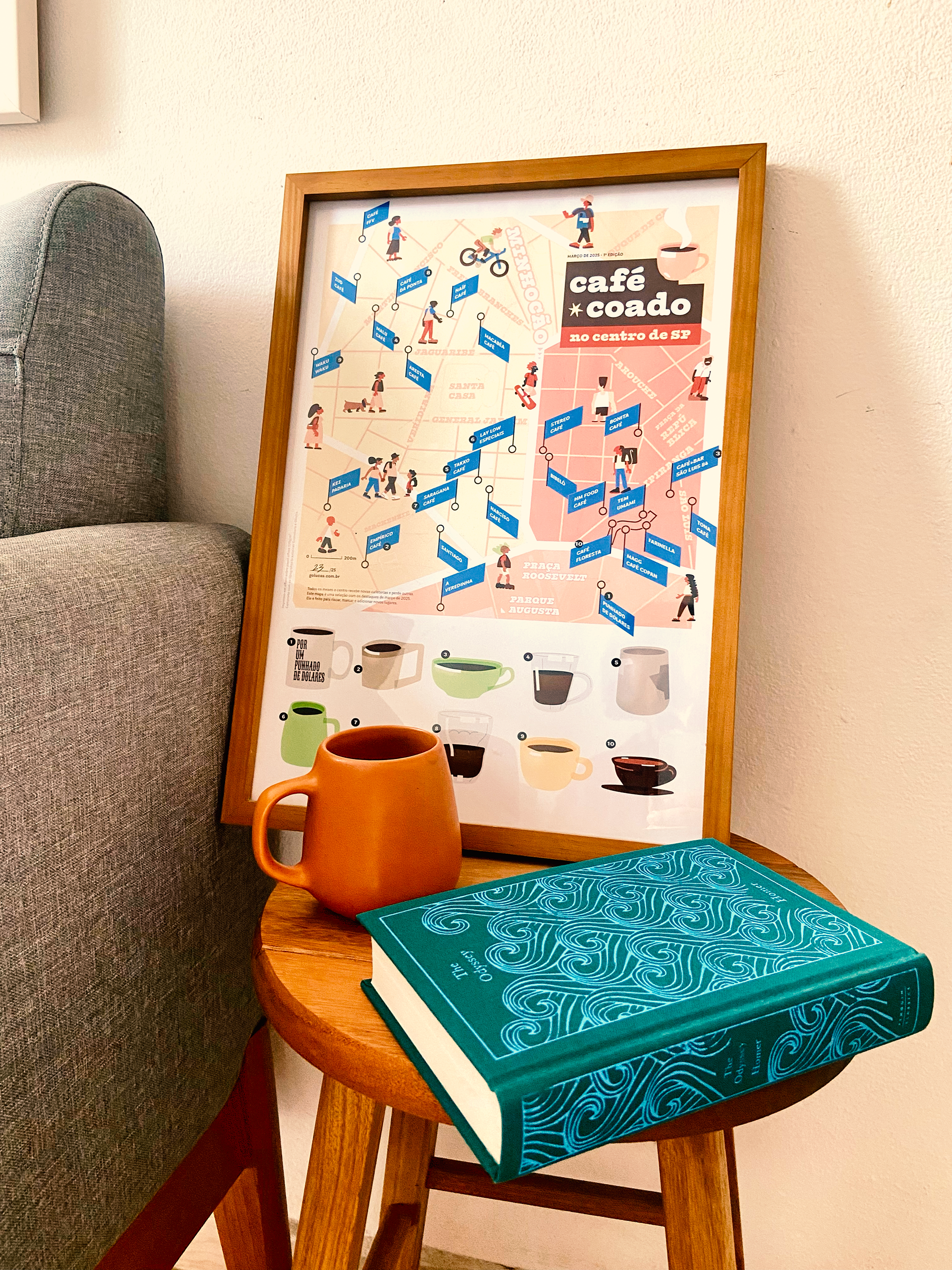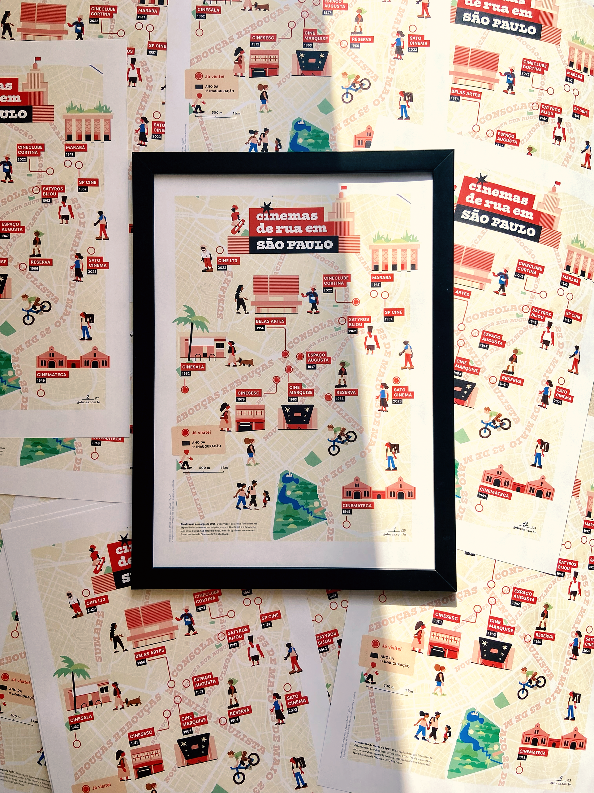 The posters '☕️ Mapa do café coado' and '🍿 Mapa dos cinemas de rua' were created for fun and to experiment with images. The variety of cafeterias and cultural options is why I love living in downtown São Paulo. I wanted to capture this artistically.